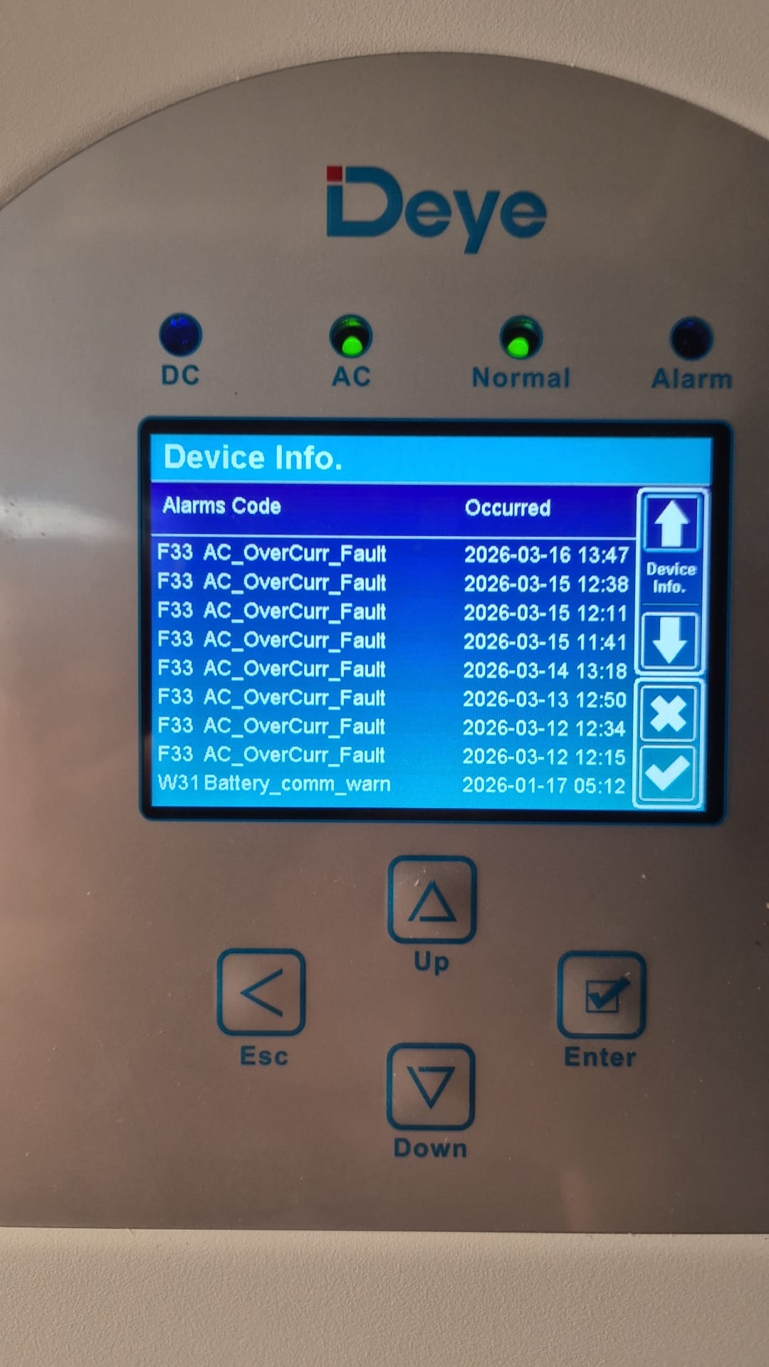 | Model note Denne artikel bruger F33 i den forstand, der findes i Deye-manualer, hvor F33 er betegnet som en AC-overstrømsfejl. På nogle andre produktfamilier kan den tilsvarende AC-sidealarm vises under et nærliggende kodenummer. Den diagnostiske logik forbliver stort set den samme. |